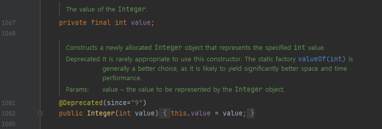 클래스 내부에 value 변수가 있다. 생성자를 통해 Integer를 생성할 떄 받아온 값을 value에 저장하는 것을 확인할 수 있다. 래퍼는 내부에 데이터 값을 감싸고 있는 하나의 객체이다.