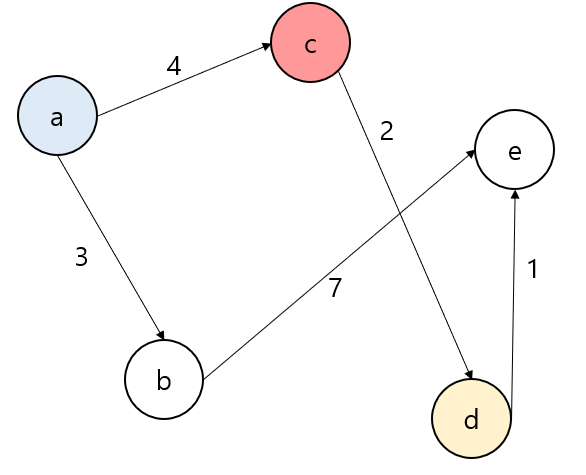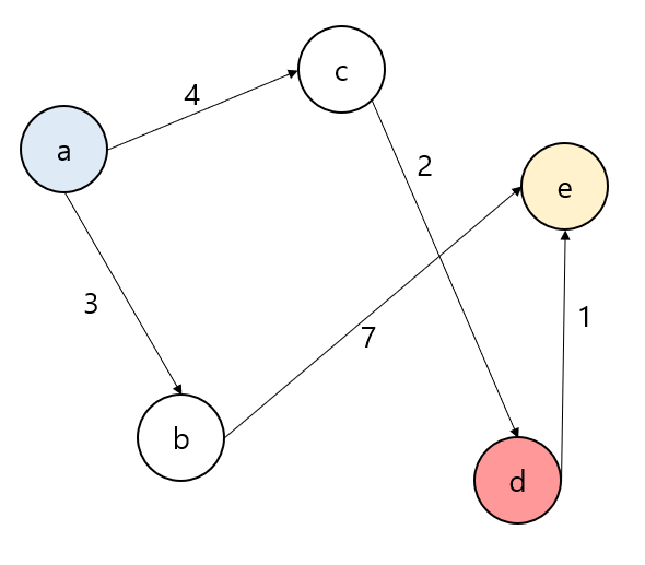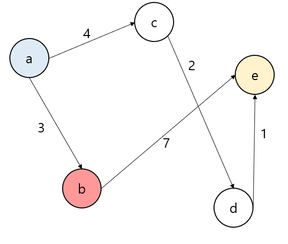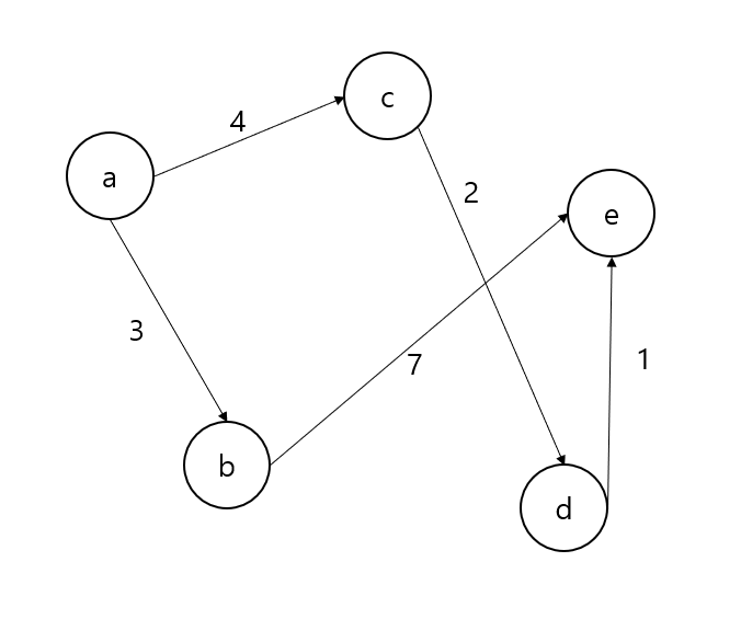a에서 e로 가는 최단 경로를 구한다고 가정하자. 정점이 5개 있기 때문에, 크기가 5인 1차원 배열에 최단 거리의 값을 저장할 것이다.