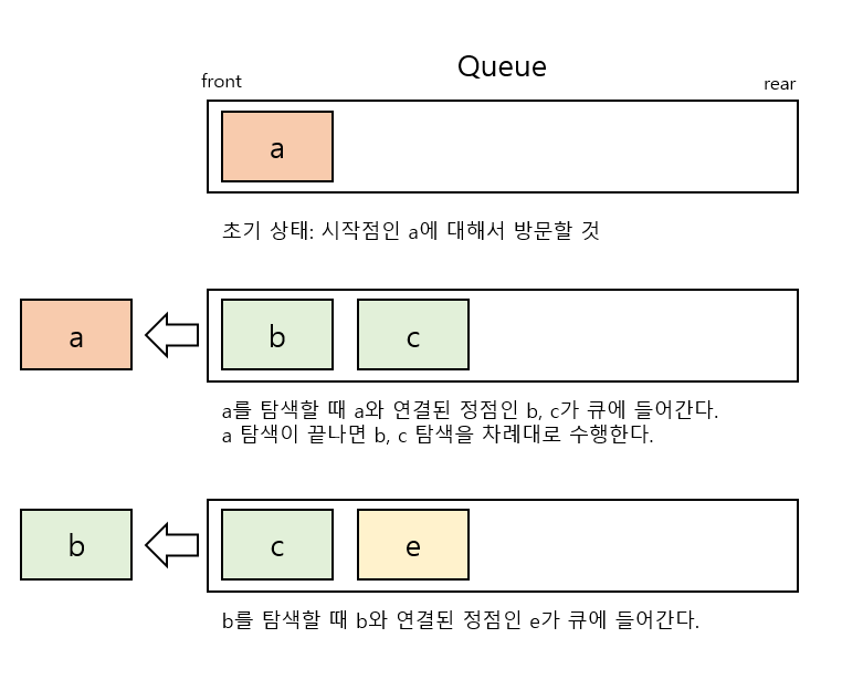 Queue에 나온대로, a를 방문할 때 Queue에서 a를 제거하고 b, c를 넣는다. 그리고 다음 수행 때 b를 제거한 뒤, b와 연결되어 있는 e를 넣는다.