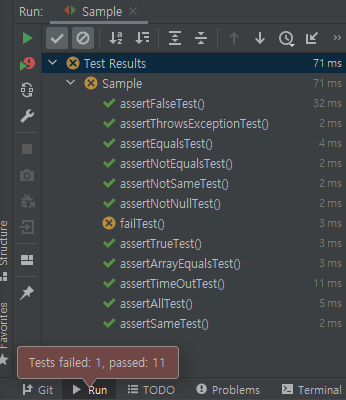 Assertions에는 JUnit 테스트를 위한 메소드가 있다. 테스트를 할 때 상태를 확인하기 위한 메소드를 제공한다.