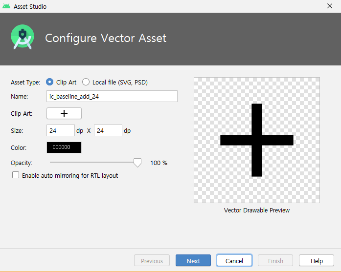Android 스튜디오에는 머티리얼 아이콘을 추가하고 SVG(Scalable Vector Graphic)와 PSD(Adobe Photoshop Document) 파일을 벡터 드로어블 리소스로 프로젝트에 가져올 수 있는 Vector Asset Studio라는 도구가 포함되어