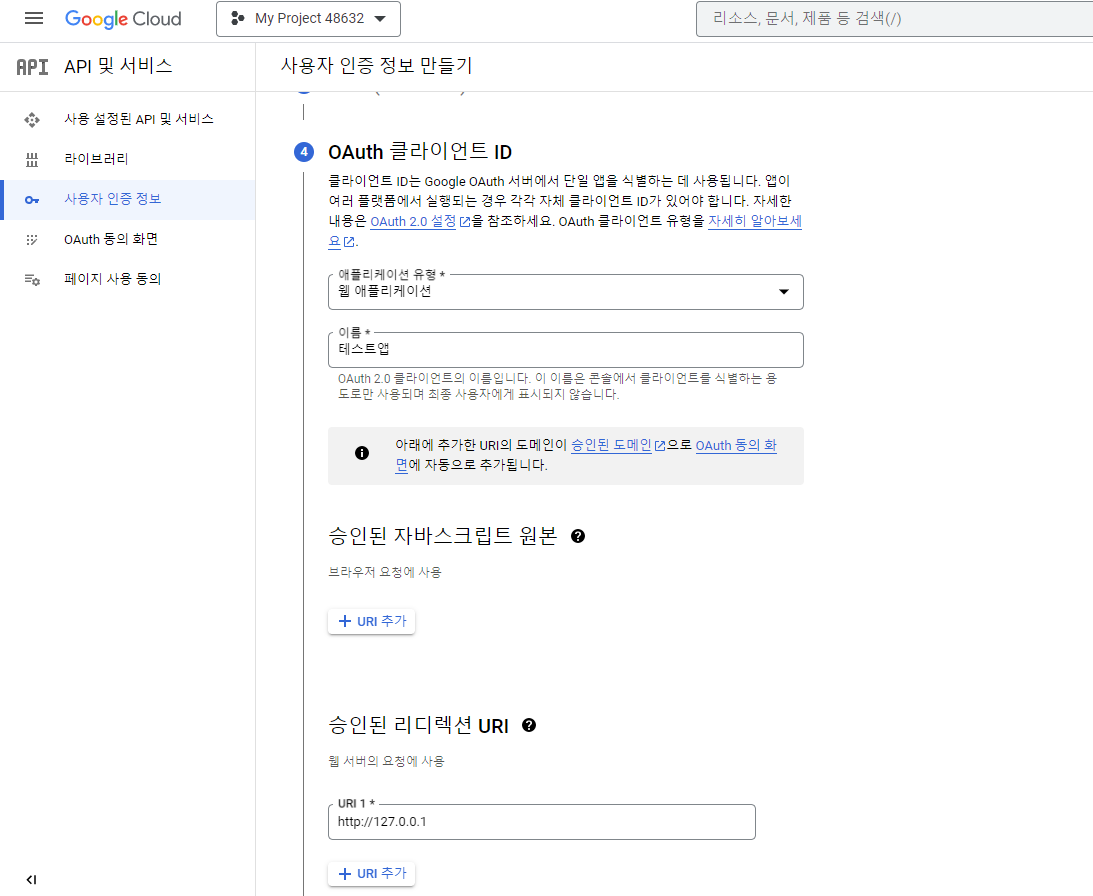 승인된 리디렉션 URI가 중요한데, OAuth에서 인증하는 로직과 관련이 있다.