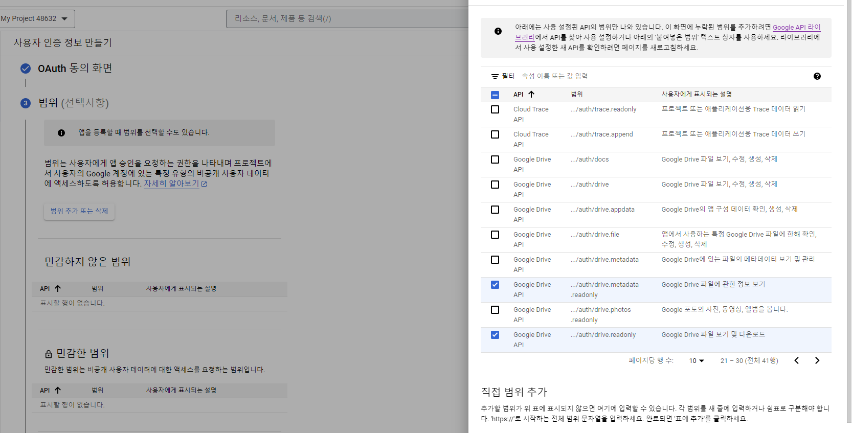 나는 구글 드라이브 API만 사용할 거라서 1개만 선택했다.
