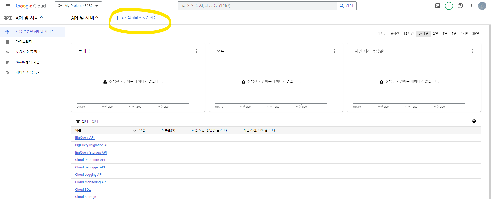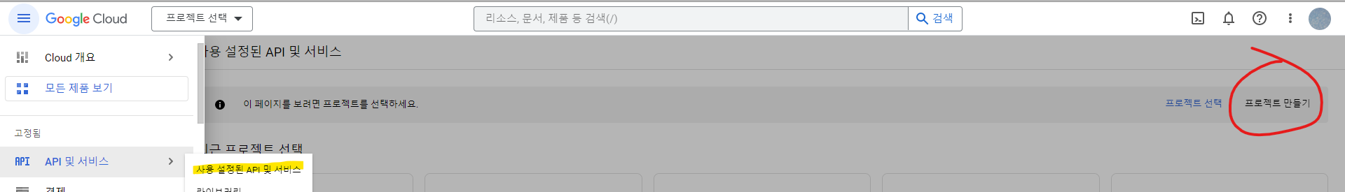 좌측 메뉴에서 API 및 서비스 > 사용 설정된 API 및 서비스 선택한 후 우측 상단에서 프로젝트 만들기 클릭.