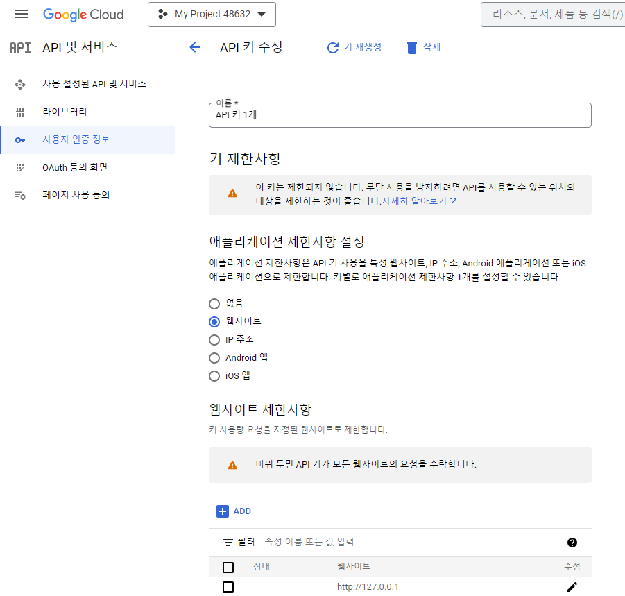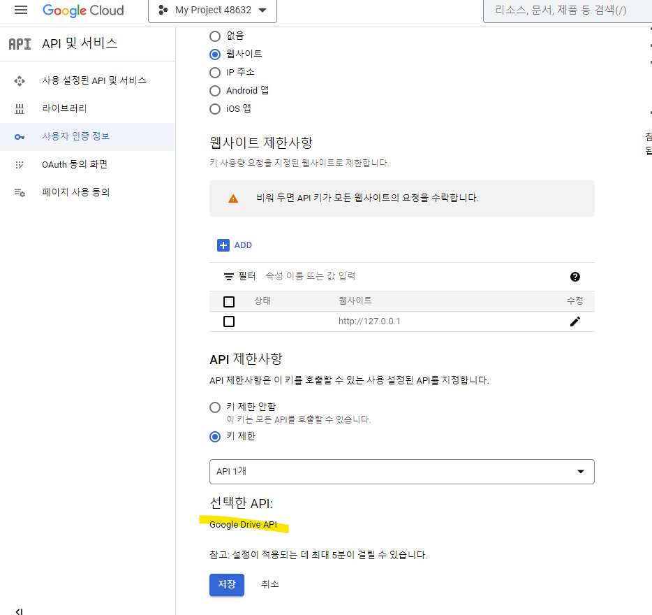 1. 애플리케이션 제한사항 설정 -> 환경에 맞게 항목 선택하고 요청받을 웹사이트도 입력한다.