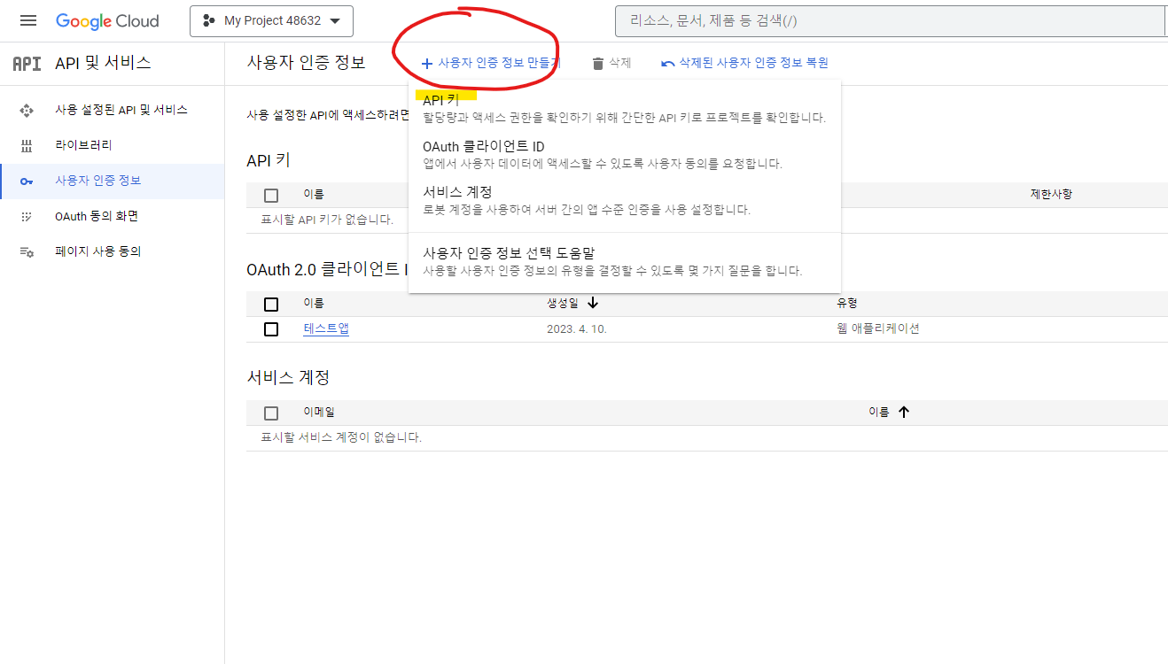 이제 API 키를 만들어준다.
