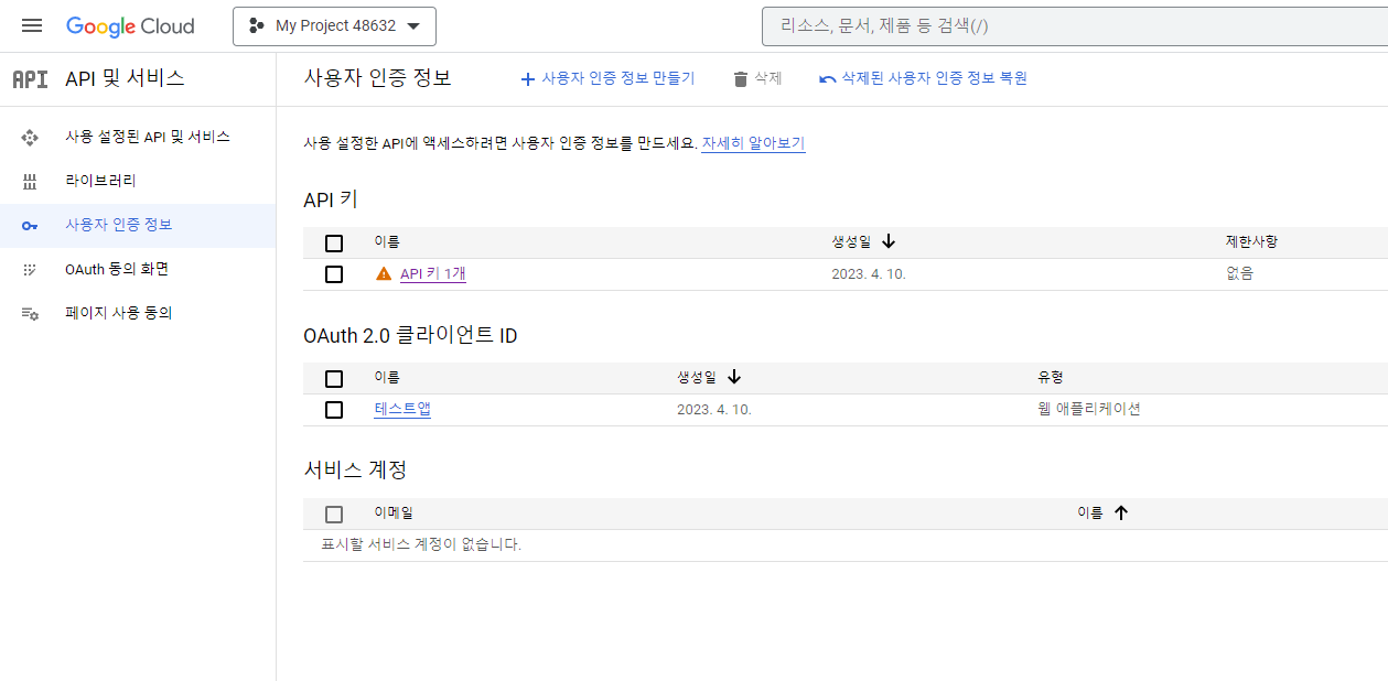 좌측메뉴 > 사용자인증정보 클릭하면 방금 만든 OAuth 키를 볼 수 있다.
