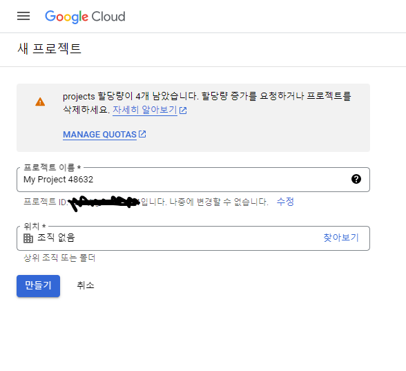 google cloud console에 들어간 뒤 프로젝트를 생성해야 한다.